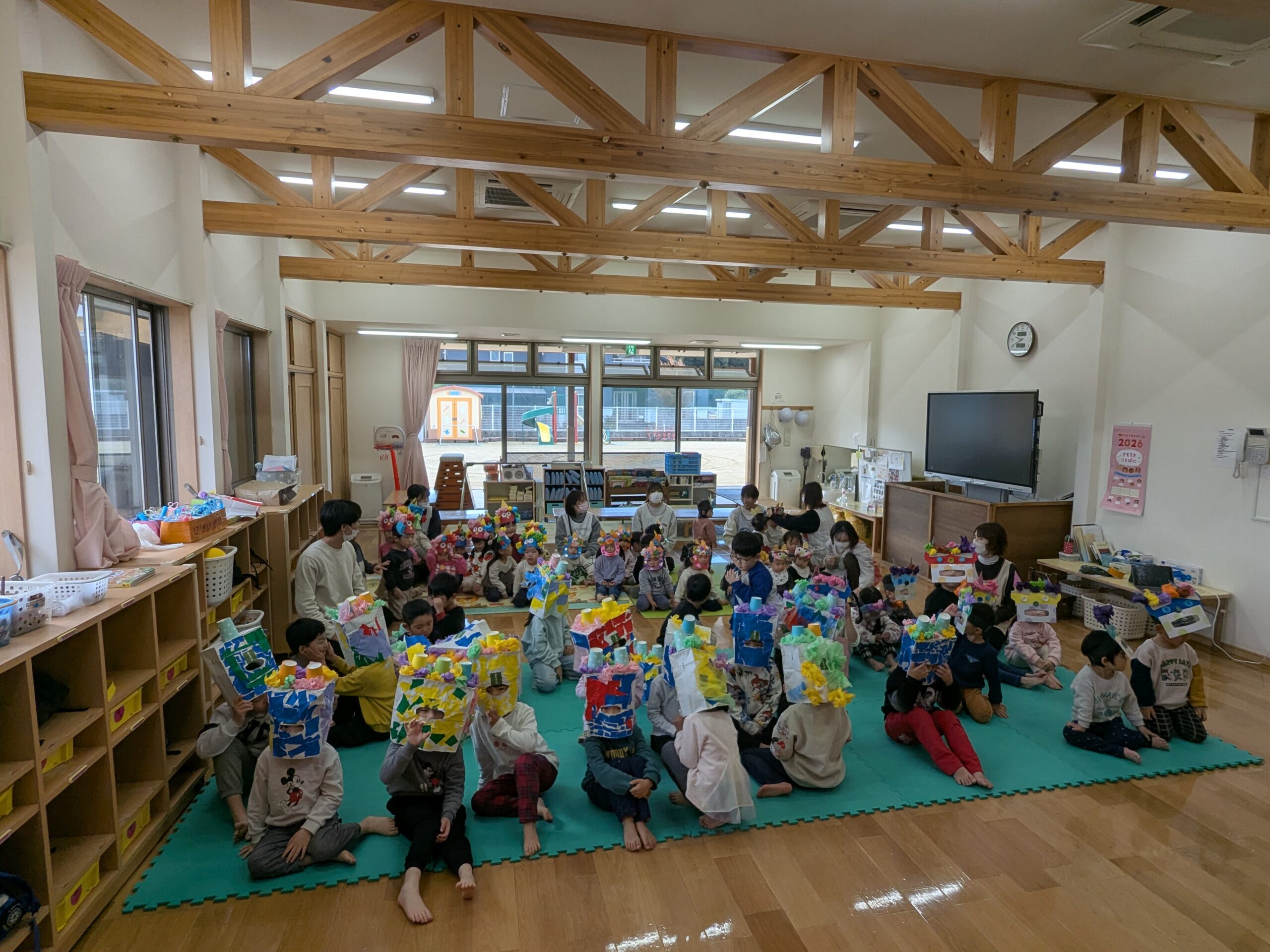 いろんな鬼面をつけた太山寺保育園の子ども達がホールへ終結✨