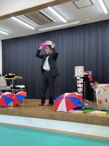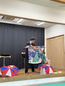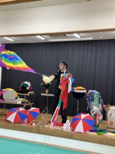 そして今日は、ミスタークボックさんが手品を披露してくださいました。布が傘に変身したり、不思議なサイコロ、トランプが小さくなったり、帽子になったり・・・。ちょっとだけ、たんぽぽ組の先生もクボックさんのお手伝い。びっくりしたり、大笑いしたり、たくさんの拍手で大喜びの子ども達でした。ミスタークボックさん、ありがとうございました。