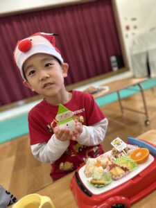 給食のメニューは、可愛い雪だるまさん付きのクリスマスライス、フライドチキン、ツリーポテト!おかわりもたくさんしました。美味しかったね。