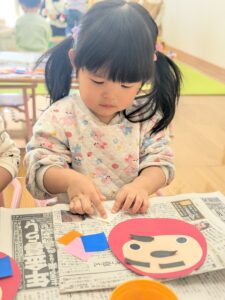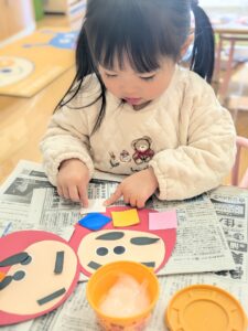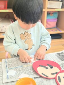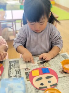 今回の制作ではなんと!!初めての糊に挑戦✨だるまさんの顔を貼っていきます。