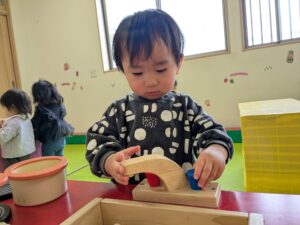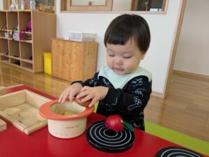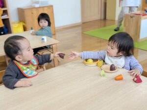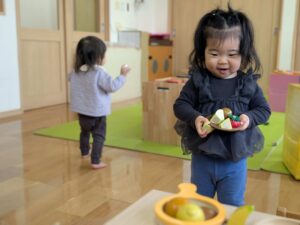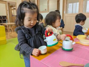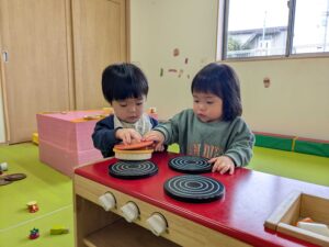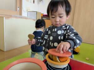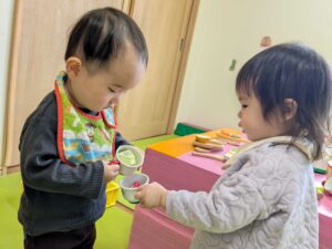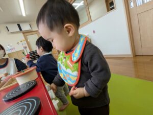 ままごと遊びにも興味が出てきています!2歳児さんのお部屋でままごと遊びを楽しみました(*^▽^*)