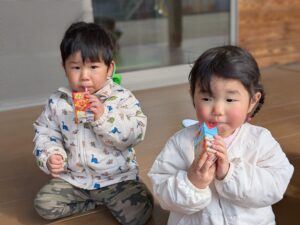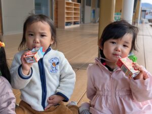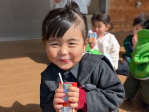 園に戻ってからちょっと休憩~。アンパンマンジュースだ~💕とみんな喜んで飲み干しました😊